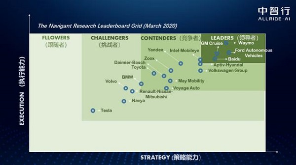 先從單車(chē)智能方面來(lái)看。2020年3月,Navigant發(fā)布了一份研究報(bào)告,對(duì)世界范圍內(nèi)的無(wú)人駕駛公司進(jìn)行了排名。結(jié)果顯示,排名在前十八的公司中,僅有一家中國(guó)公司(百度)上榜,位列第四;而特斯拉則被排到了最后。