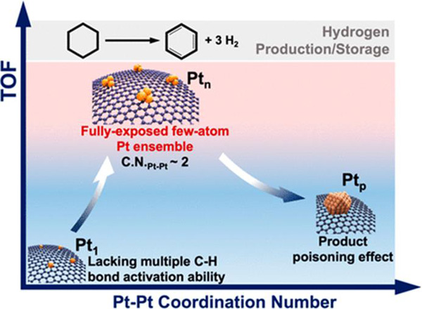研究團隊在富缺陷石墨烯包覆的納米金剛載體(ND@G)載體表面,精準構(gòu)建孤立的原子級分散鉑單原子(Pt1)、不同尺寸的全暴露鉑團簇(Ptn)以及傳統(tǒng)的鉑納米顆粒(Ptp)。在環(huán)己烷脫氫制氫反應(yīng)中,盡管Pt1具有最高的金屬原子利用效率,但即使在553 K下仍然沒有活性。相比之下,亞納米尺度全暴露Ptn團簇和Ptp納米顆粒催化材料均能催化這一脫氫反應(yīng)發(fā)生,但較大的Pt納米顆粒活性較低,而亞納米尺度完全暴露的Ptn團簇催化材料(平均Pt–Pt配位數(shù)約為2–3)顯示出最佳的催化脫氫性能。結(jié)合實驗結(jié)果與理論計算,研究發(fā)現(xiàn)Pt催化材料的活性差異主要來自C-H鍵活化過程中有限但連續(xù)的多位點集團效應(yīng)(圖1)。